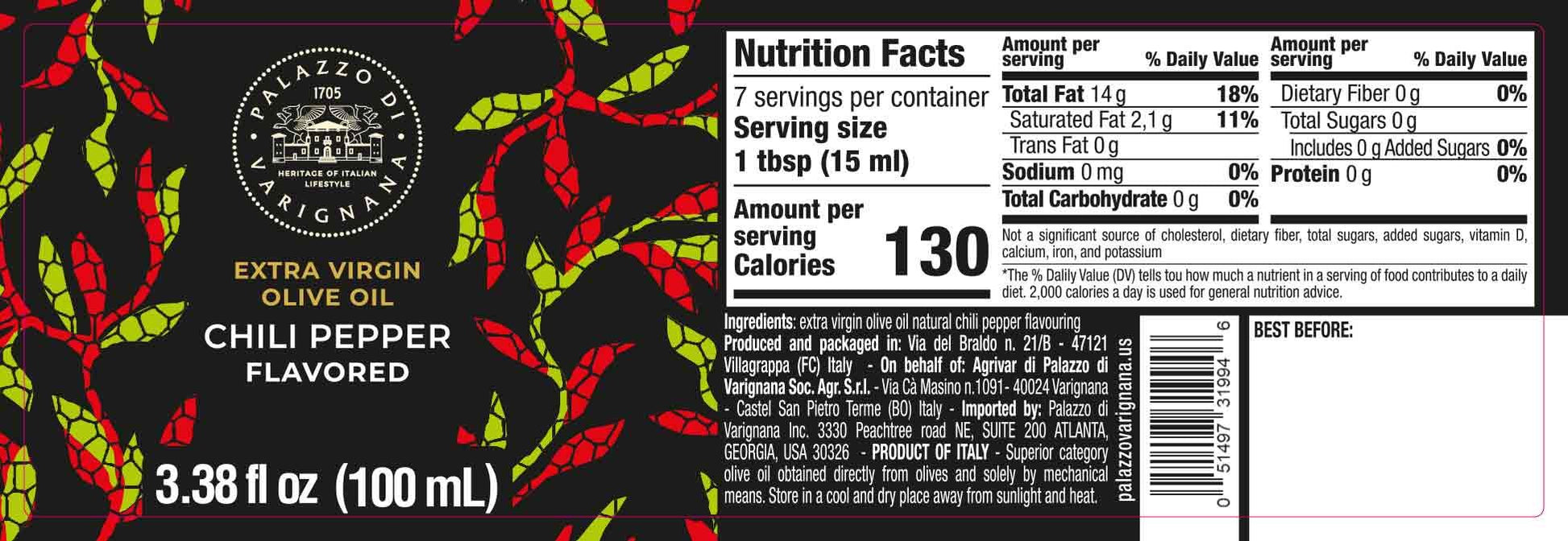 Flavors Chilli Pepper: extra virgin olive oil, natural chili pepper peel aroma